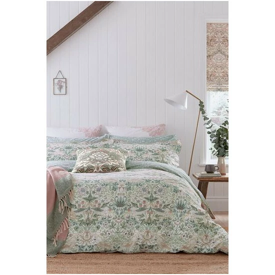 A truly iconic Morris & Co. design, Strawberry Thief combines its designer’s fascination for the dramas of nature with a love of rich, complex pattern. Originally created by William Morris in 1883, the much-loved Strawberry Thief is inspired by thrushes pinching strawberries from his kitchen garden at Kelmscott House. Translated onto bedding in an uplifting colour story, where sage greens pair with crisp pinks in a fresh garden palette across this 100% cotton percale duvet.