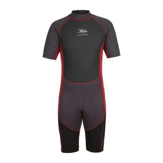 This short wetsuit is designed with a back zipper, branded Trespass zipper tape, foam with knitted backing. Thickness: 3mm. Finished off with Trespass print on the chest and print pattern on sleeves.