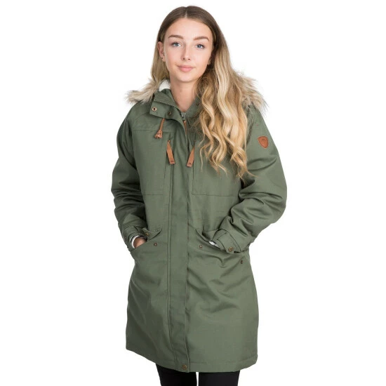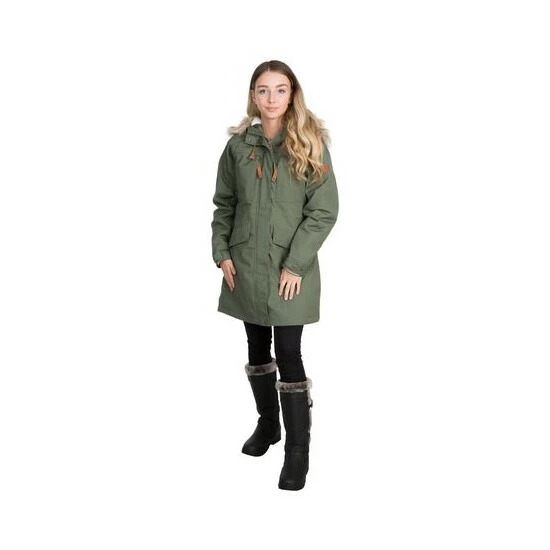 Adjustable drawcord at waist, furry fleece lining , removable hood fur trim, adjustable grown on hood, longer length with back hem vent, taped seams, padded , TP75, two patch pockets with flaps and two zip pockets, Waterproof: 3000mm. Breathable: 3000mvp. Windproof.