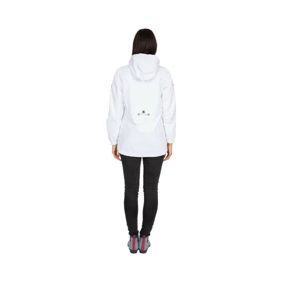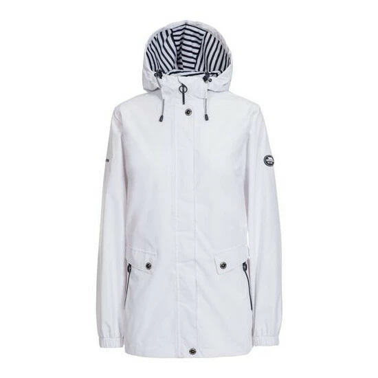 Trespass Flourish TP75 fully lined waterproof jacket for women. High-performance TPU membrane with a Fabric Performance Rating of TP75. The grown-on hood features dual adjustable string fastenings to tighten or loosen, and a striped jersey lining to detail. Long sleeves with elasticated cuffs to keep the cold out and the warmth in. Button-down storm flap concealing the full-zip front fastening. Bust darts and a curved hem for a flattering, fitted design. Fully adjustable back waist helping you find the perfect fit. Two dual-access zip pockets with press-button top envelope fastenings for the safe storage of valuables. Logo label attachment at the upper sleeve to detail. Contrasting trims to decorate and available in multiple colourways.